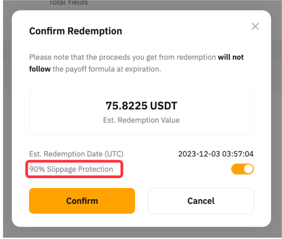 The 90% Slippage Protection on your Double-Win redemption confirmation window means that if the actual redemption amount is less than 90% of the estimated value, the redemption will fail. Your Double-Win plan, however, will remain unaffected and valid. This setting is enabled by default.