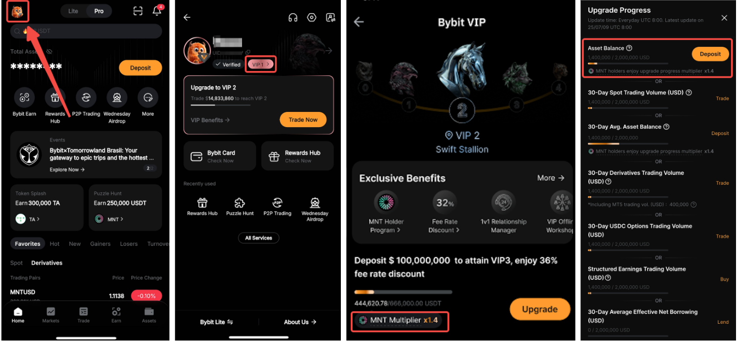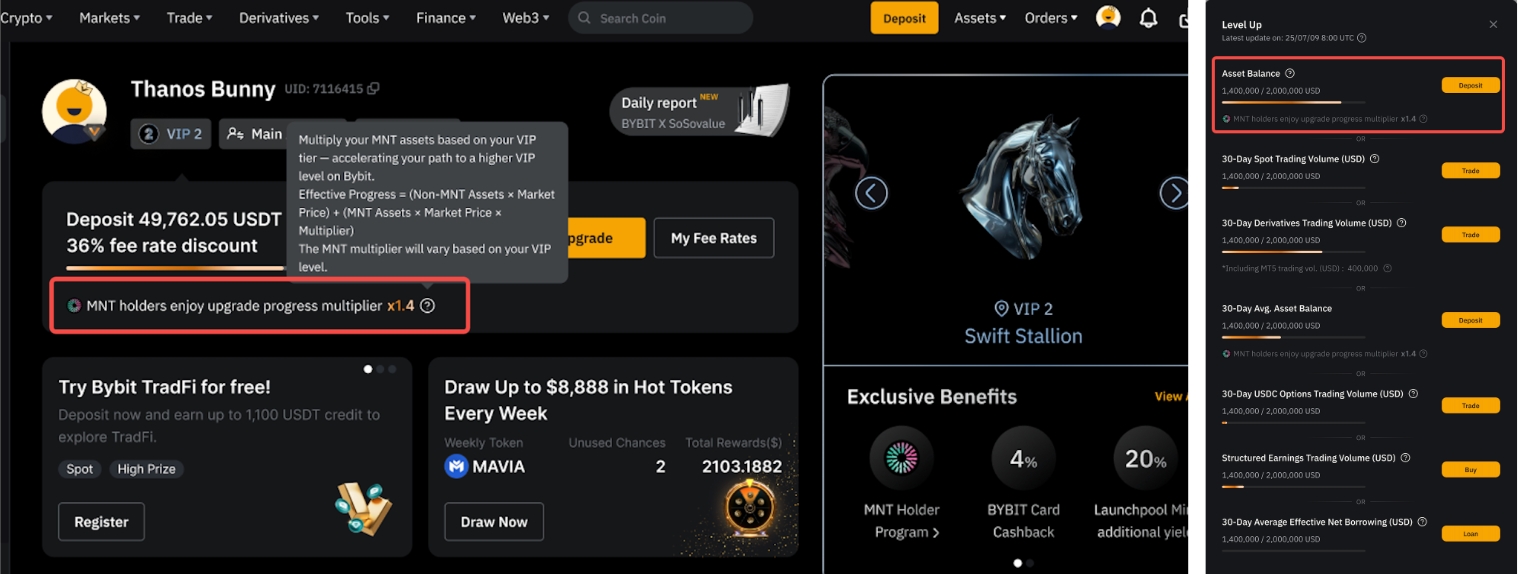 The MNT multiplier is a benefit for MNT holders that accelerates VIP progression by assigning additional weight to MNT in asset value calculations. Depending on your VIP tier, your MNT holdings may count for more toward your total asset value. For details, please refer to Introduction to the MNT Program.