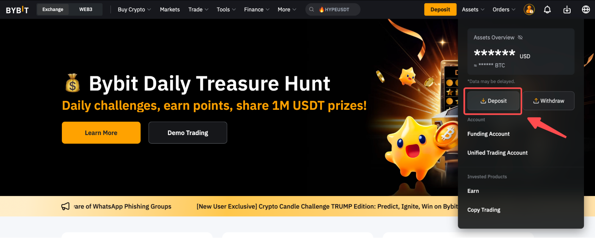 Крім того, ви також можете навести курсор на Активи у верхньому правому куті головної сторінки Bybit. Потім натиснути Поповнити, щоб перейти на сторінку депозиту.