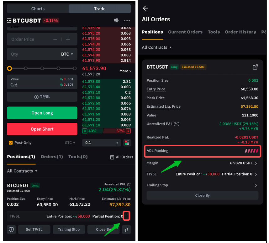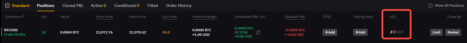 Nhà giao dịch có thứ hạng ADL cao nhất sẽ được chọn đầu tiên để giảm đòn bẩy. Nhà giao dịch có thể tham khảo đèn chỉ báo ưu tiên ADL trên vị thế của mình để đánh giá thứ hạng ADL.