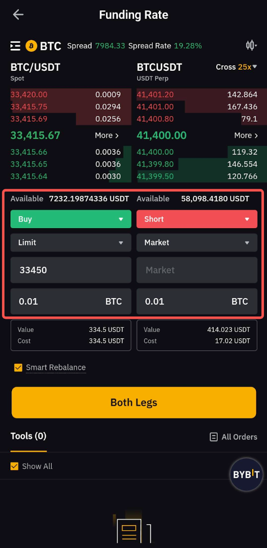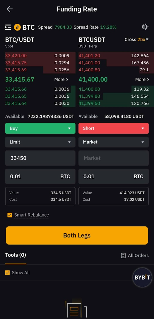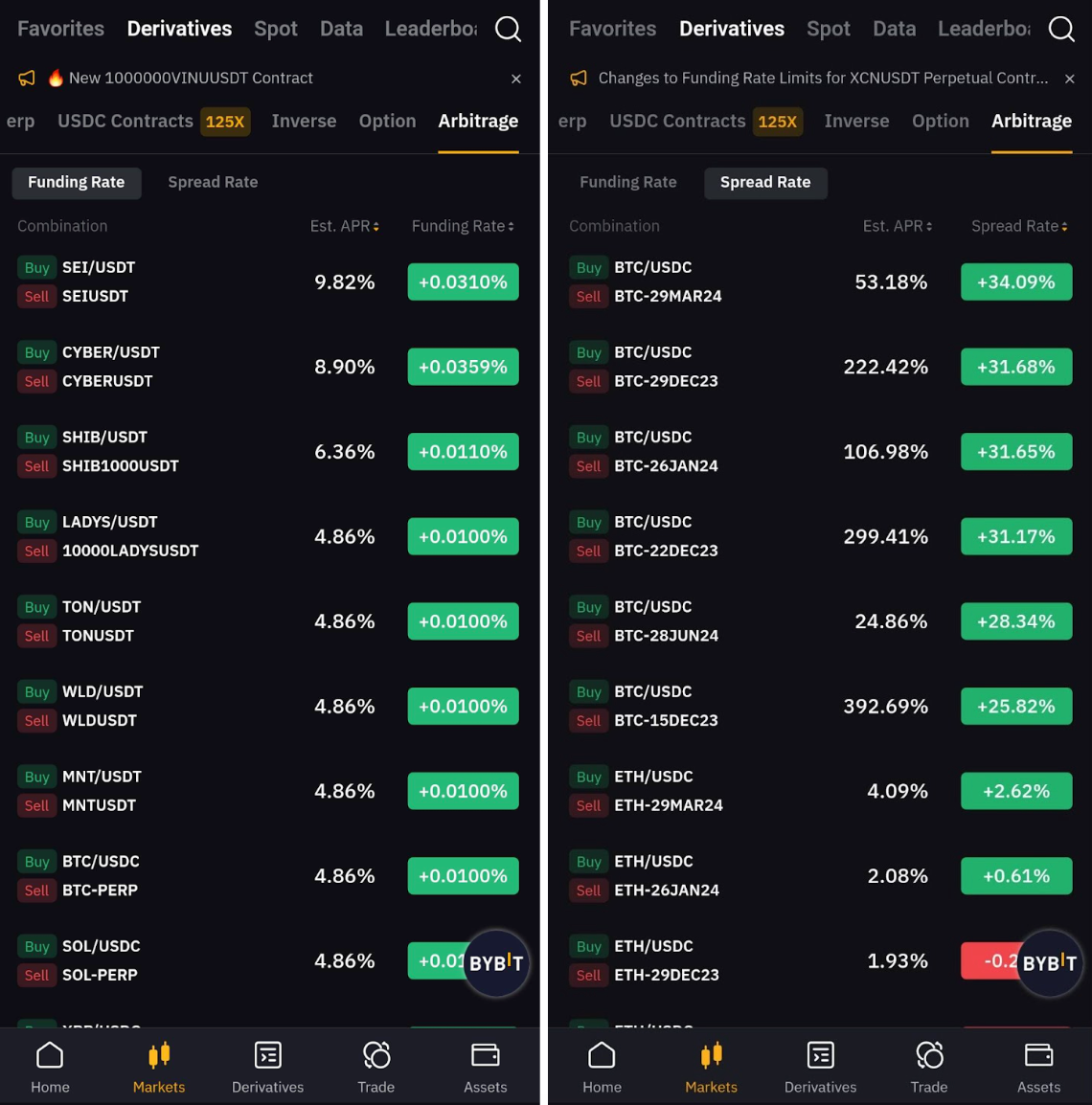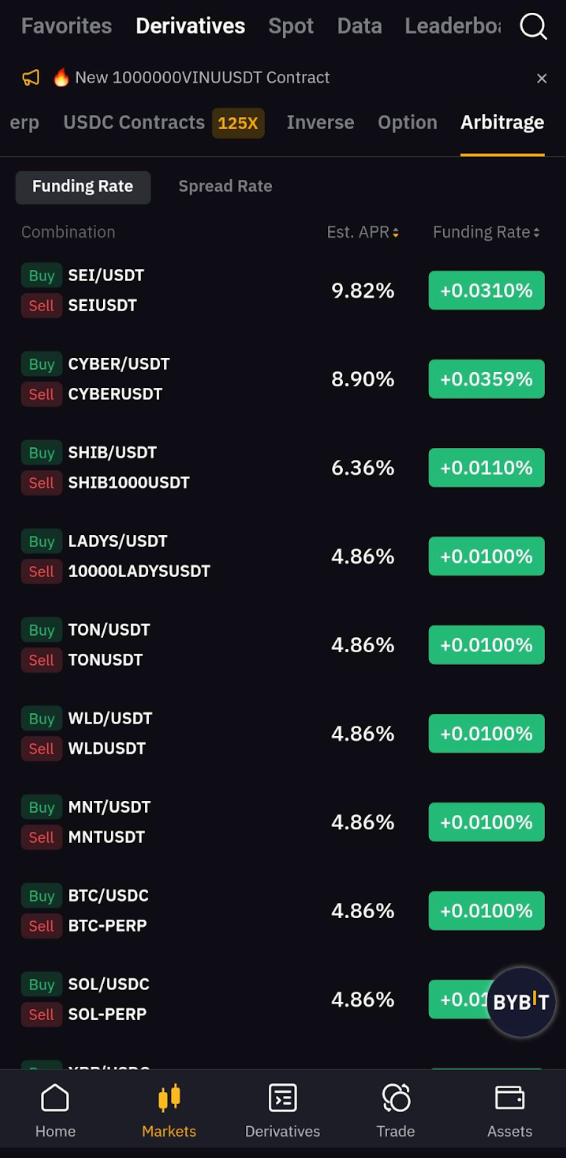 套利机会:Bybit 套利下单是一个快速发现套利机会的渠道。交易界面根据资金费率或价差排列交易对,为交易者直观展示潜在的套利机会。
