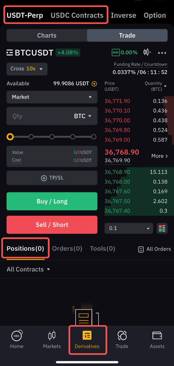 • 要查看您的持仓,请前往永续及交割合约交易页面持仓