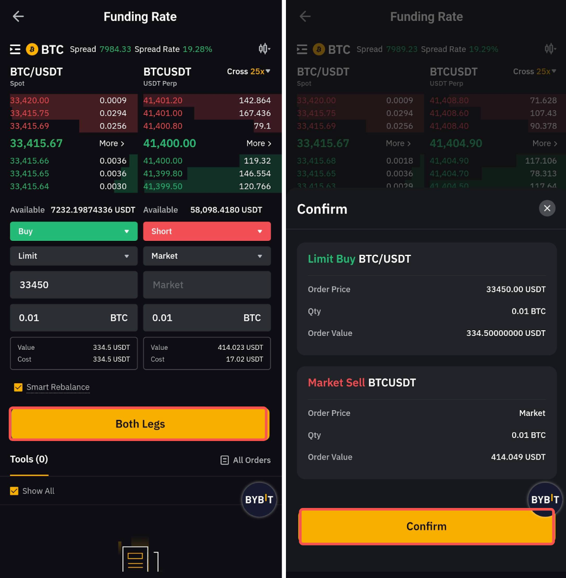 • 选择市价单或限价单。输入订单价格时,您可以参考交易对旁边的资金费率或价差率来衡量套利成本。