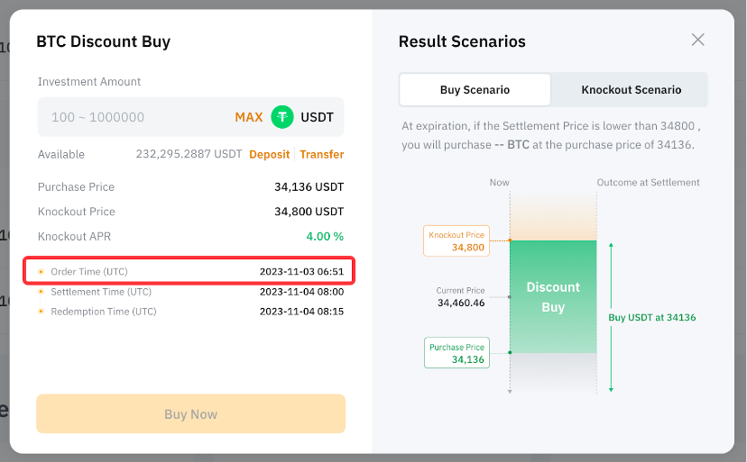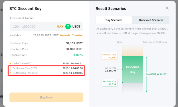 - 如选择折价买币,即使结算价格高于购买价格,用户也能以购买价格买币。