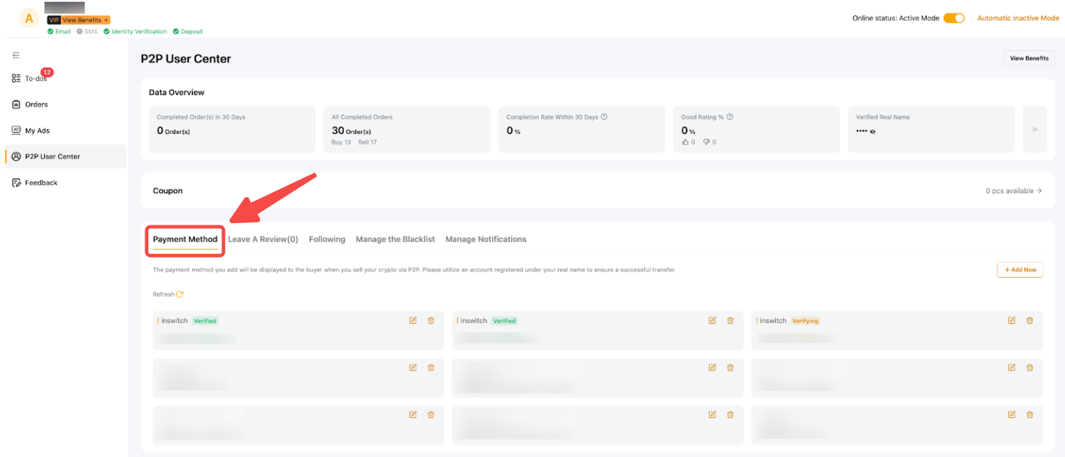 您可以在付款方式页面查看验证状态。要访问此页面,请转到 P2P 用户中心付款方式