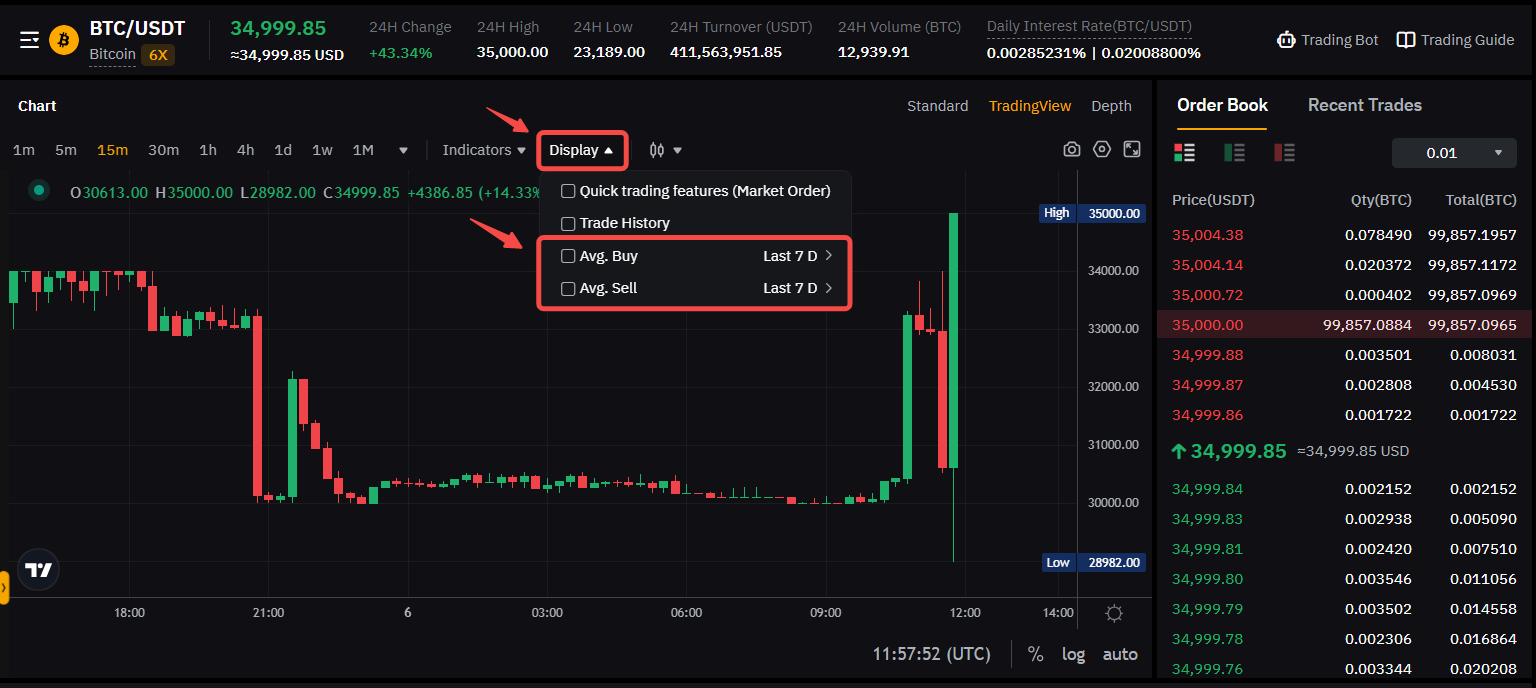 在现货交易时,您可以直接在交易图表上显示您的卖出和买入订单的平均价格。要启动它,请点击“显示”并勾选您想要查看的平均价格。您也可以选择计算平均值的时间段(最近 7、30、60 或 90 天)。请注意,平均价格将从当天到所选期间的最后一天计算。