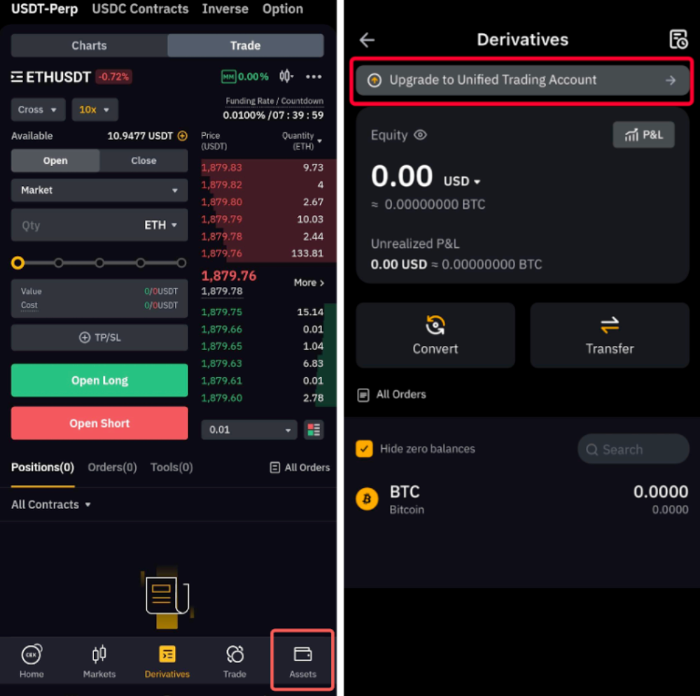 使用 UTA,您将在资产页面上看到统一交易账户类型。 要交易现货、现货保证金、杠杆代币、USDT 永续、USDC 永续与交割、反向永续与交割以及 USDC 期权,请确保您已将保证金资产划转至统一交易账户。