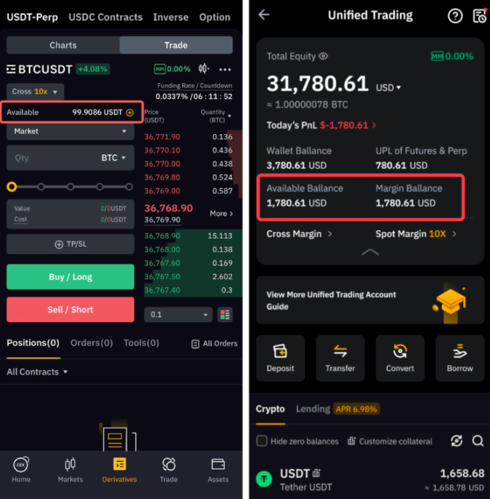 仅 UTA 全仓保证金和组合保证金模式会涉及保证金余额。保证金余额是指您账户中可用作保证金的总金额,包括账户余额与永续合约未结盈亏。如果保证金余额低于维持保证金,将触发强制平仓。请注意,保证金余额是考虑了资产指数价格和抵押品价值比率后的折算值,并非您账户中实际持有的 USD 金额。