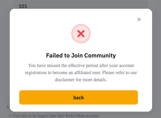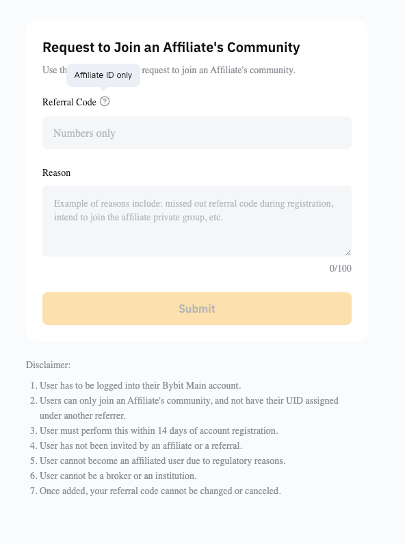 用户在报名期间可能因各种原因而错过添加代理或 KOL 邀请码。因此,Bybit 现支持用户在注册加入代理社区后的 14 天内手动添加邀请码。