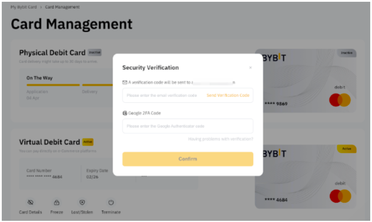 您可以在卡管理页面上管理您的虚拟和实体 Bybit Card。