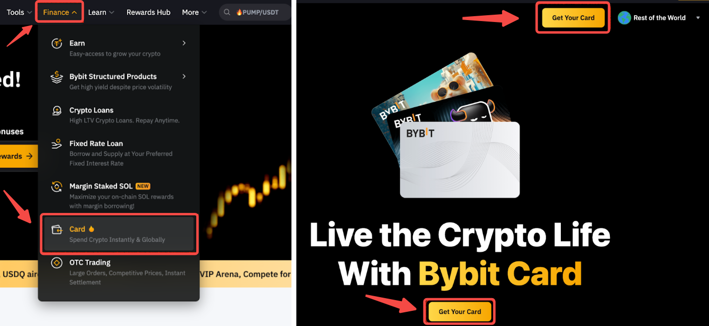 第 1 步: 前往金融 → 。点击 Bybit Card 申请实体卡横幅上的立即申请