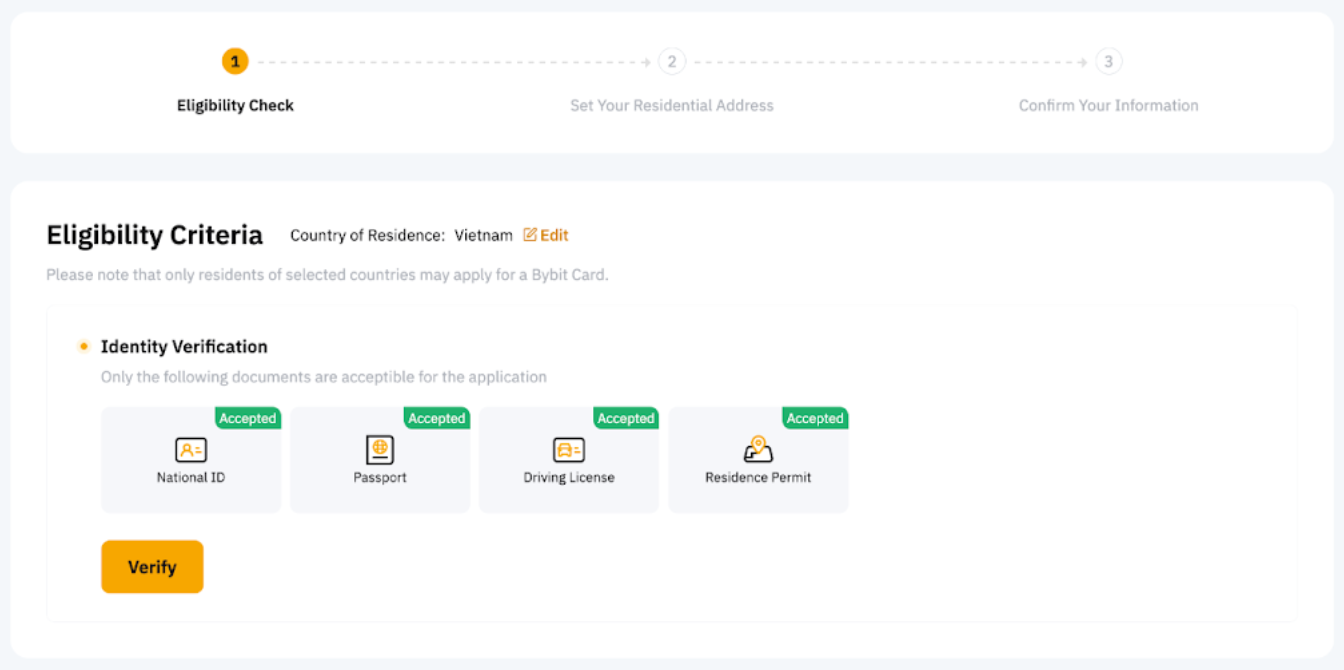 :Bybit Card 对身份认证的要求更为严格。因此,即使您之前已在 Bybit 账户中完成身份认证,您仍可能需要更新身份认证。