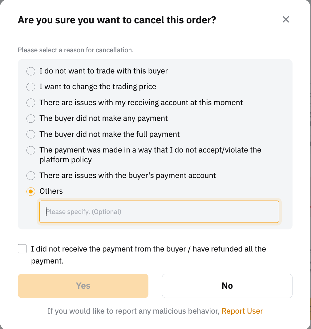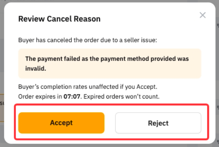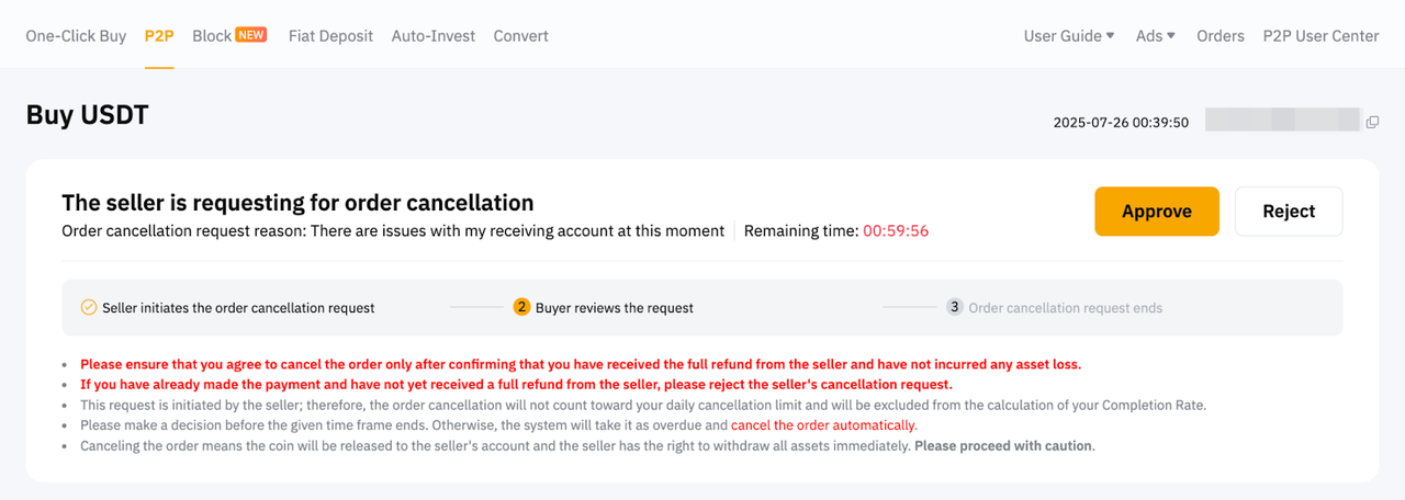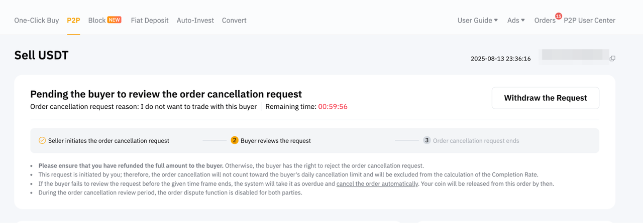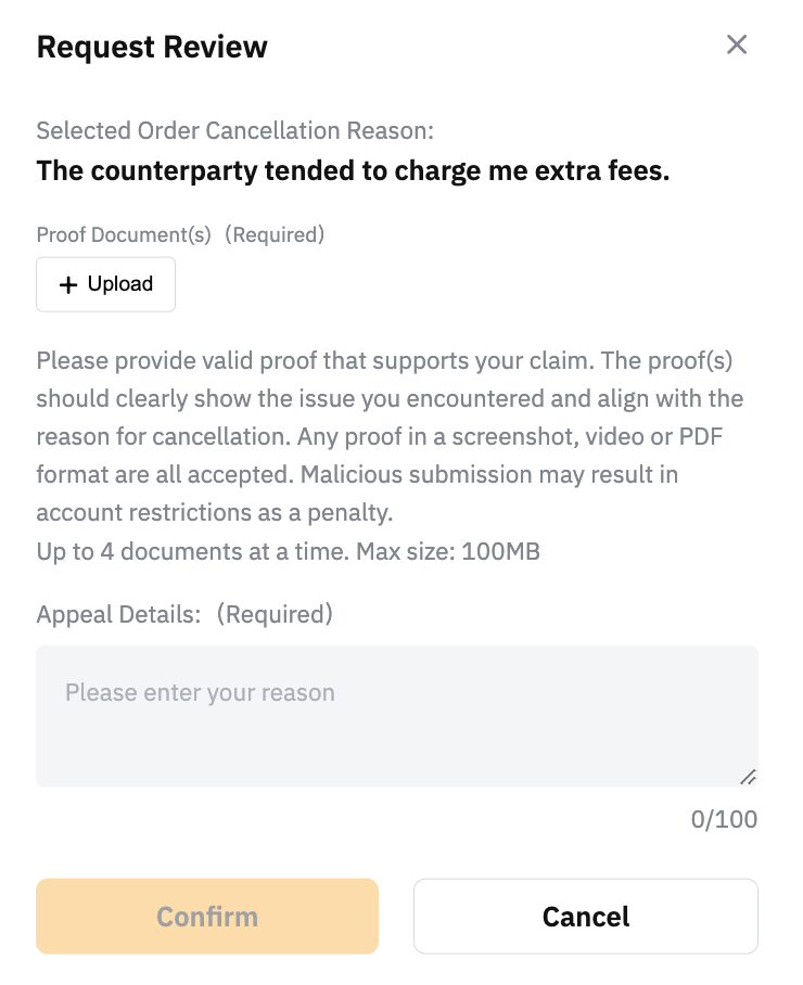 如果您坚信取消是由于卖方的过错造成的,请点击请求审查并提供支持您申诉的有效证明,提交上诉。P2P 专员将在 1-2 个工作日内协助您的请求。