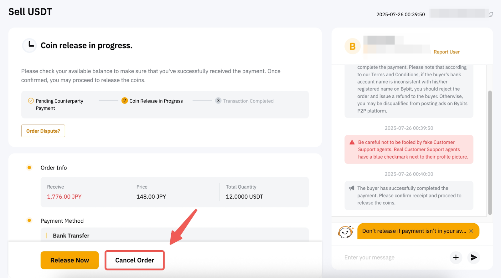 2. 卖方可提交订单取消请求,供买方在订单状态为正在释放货币时确认。