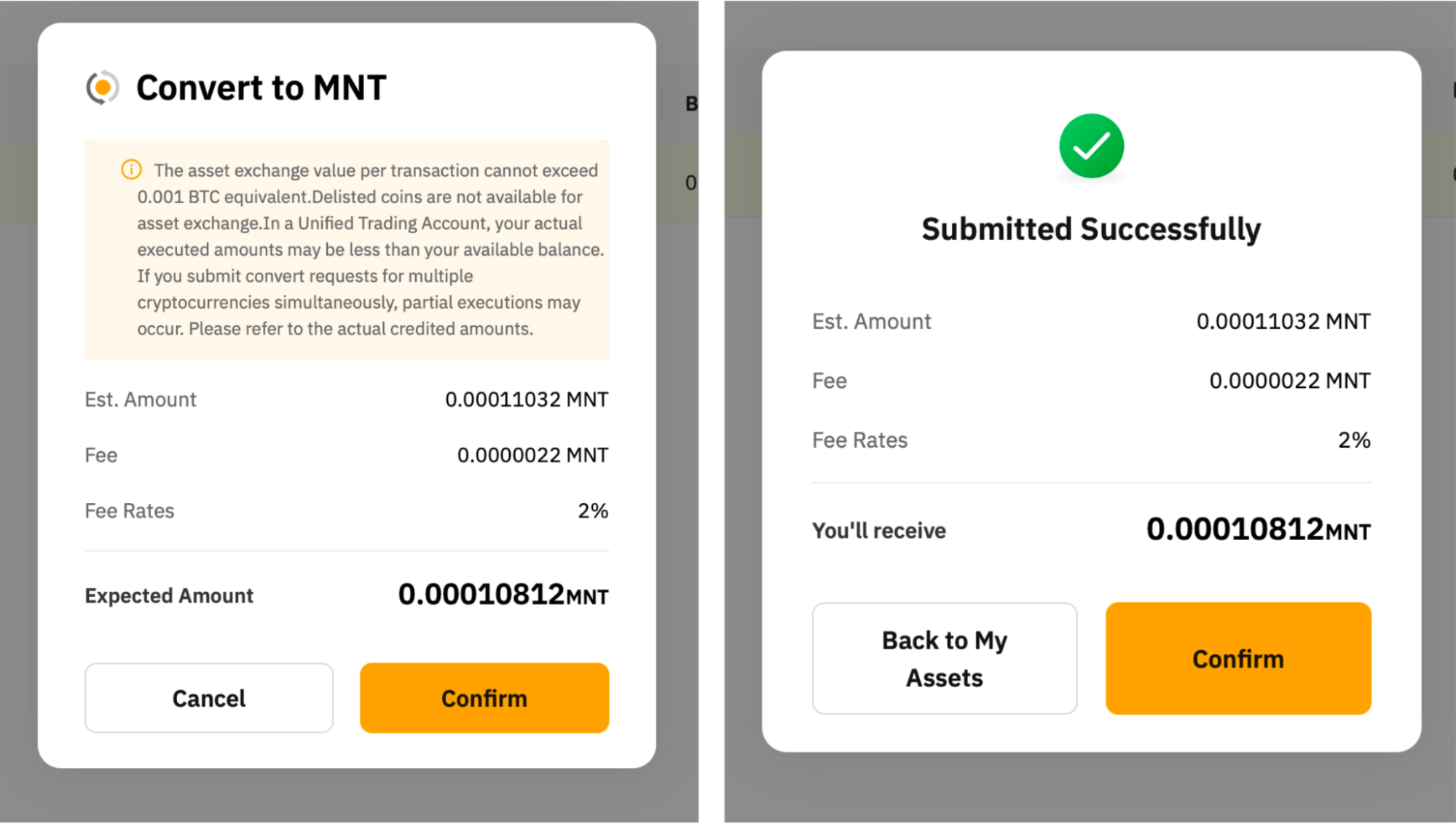 — 每笔交易的资产兑换价值不能超过0.001 BTC等值,且不能低于0.00000001 MNT等值。