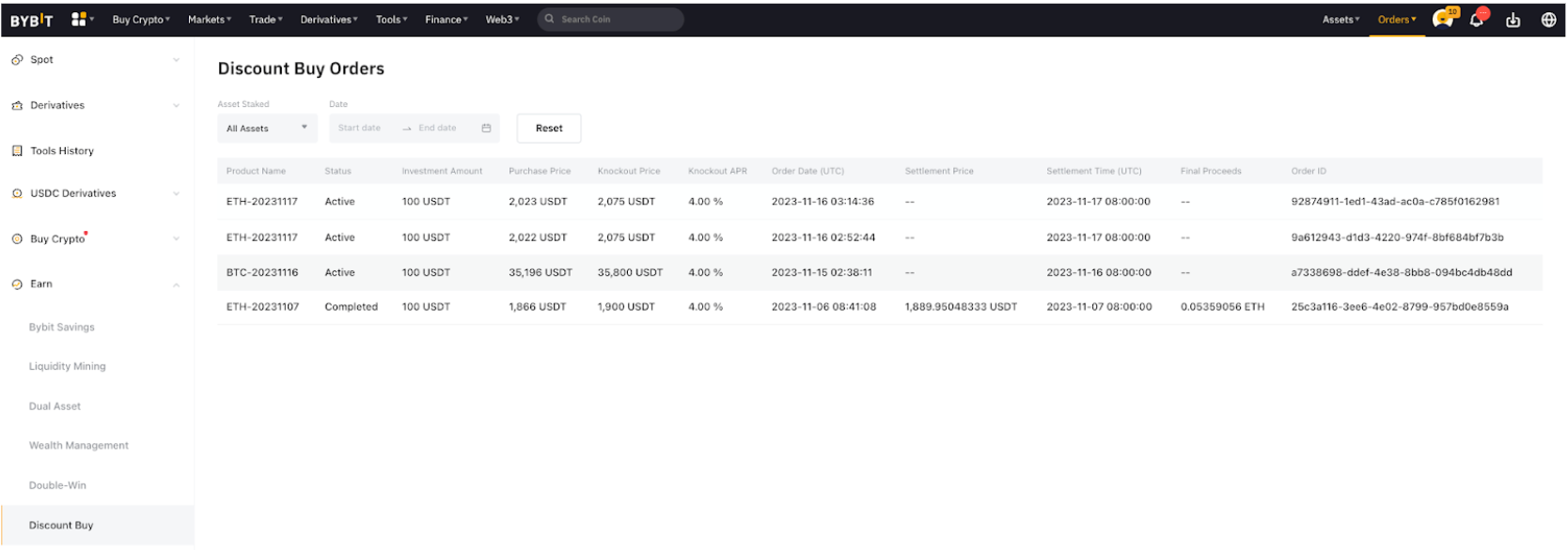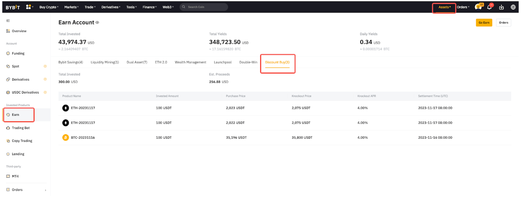 或者,点击 Bybit 页面右上角的资产,进入理财账户页面,在此即可查看当前订单。
