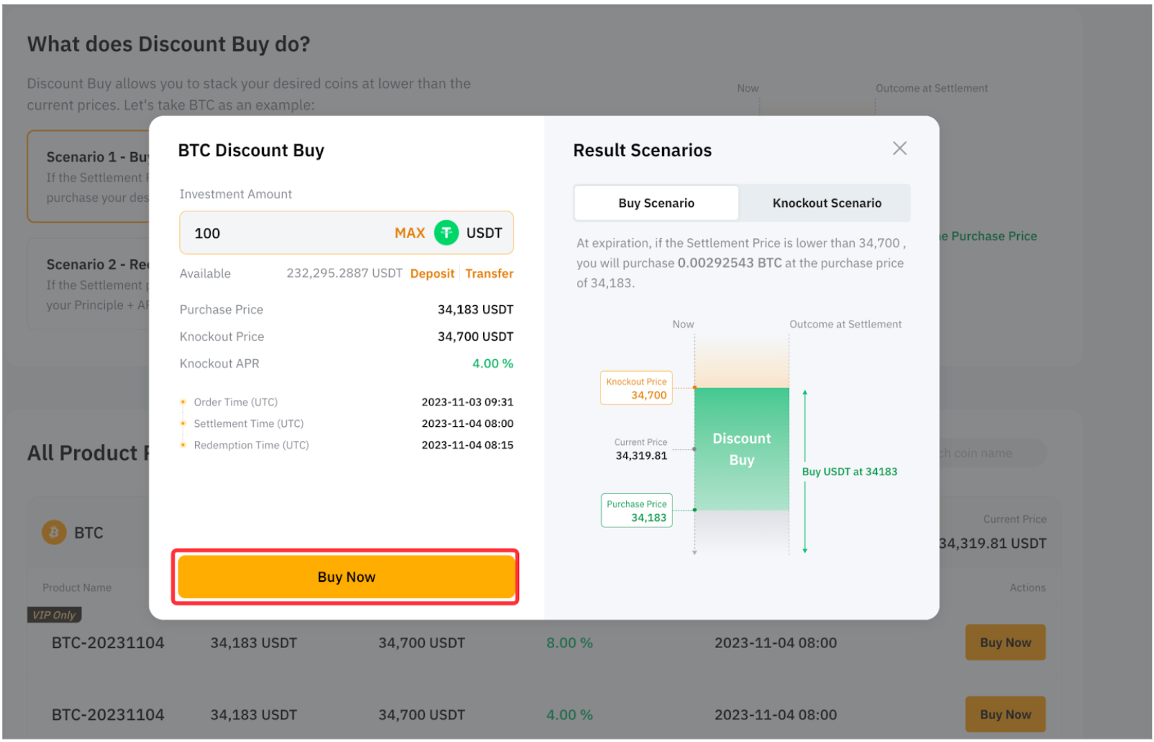 - 如果结算价格高于或等于敲出价格,则可拿回本金并获得额外的 USDT 年化收益。