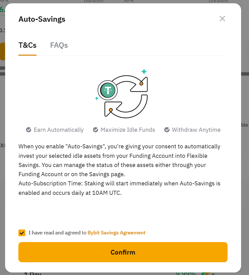 自动理财功能可将您资金账户中的闲置资产用于自动申购活期轻松理财产品。开通此功能后,您指定币种的闲置资产将于每日 10:00 (UTC) 自动投入活期轻松理财。