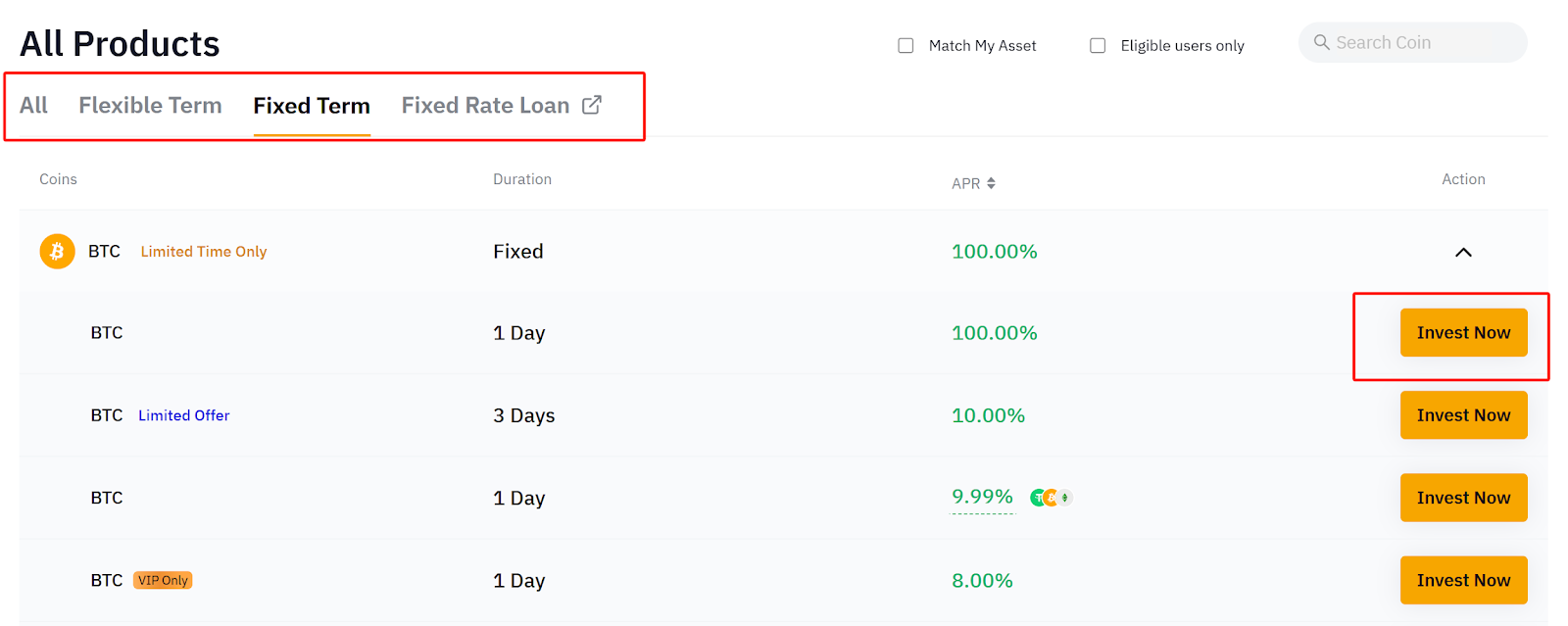 第 2 步:根据币种、期限和年化收益率选择您偏好的轻松理财方案,随后点击立即投资。
