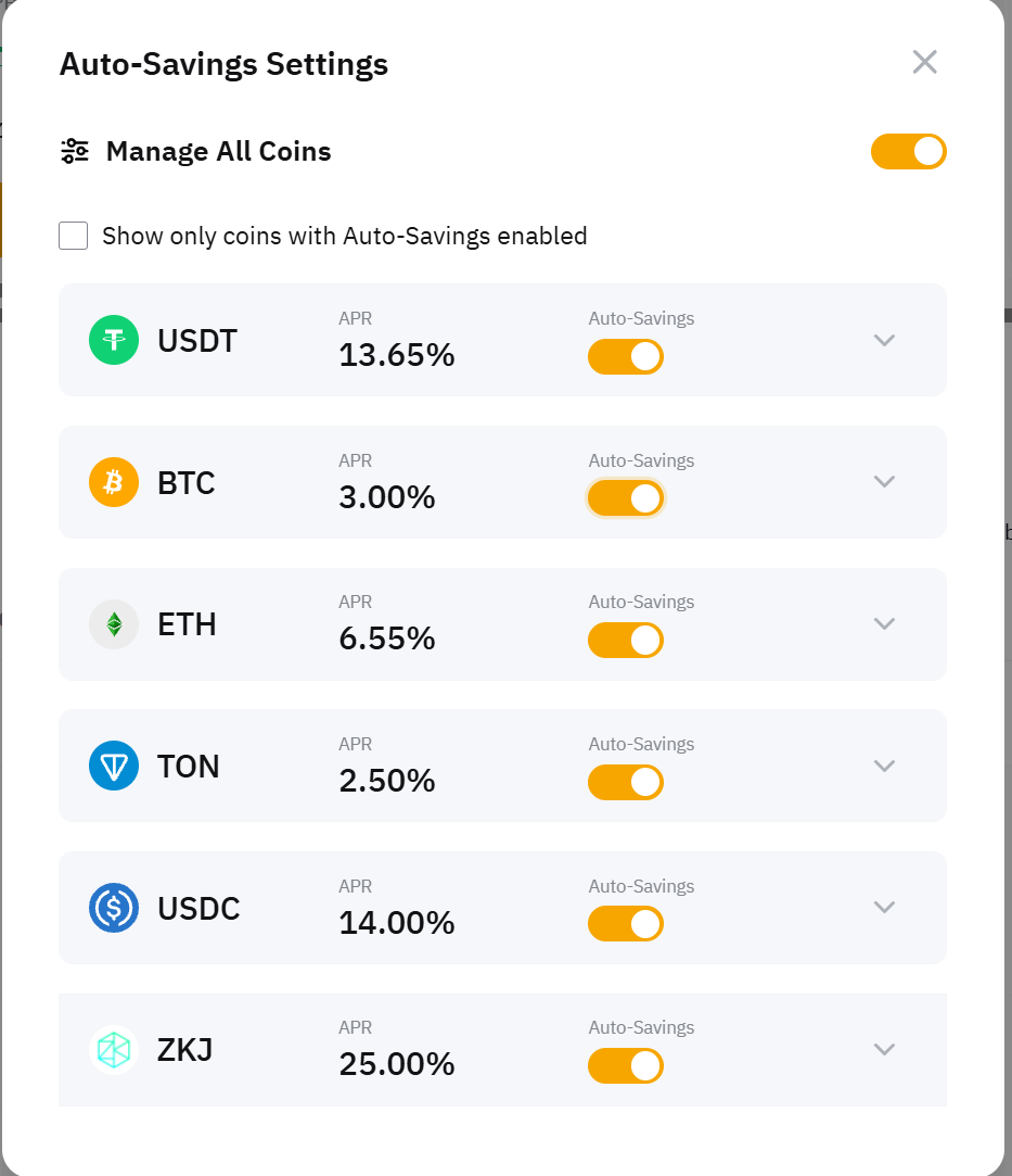 第 3 步:点击确认。系统将跳转至自动理财设置页面。管理所有币种功能默认开启。您可在此页面针对每个支持的币种单独开通或关闭自动理财功能。