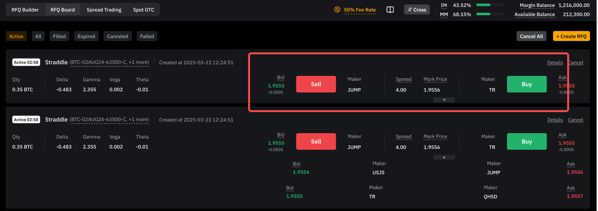 第 2 步:当前有效标签页项下会显示匹配您 RFQ 的最优买卖报价。点击展开图标,即可查看最多 3 个最具竞争力的报价,然后点击买入或卖出即可接受报价。