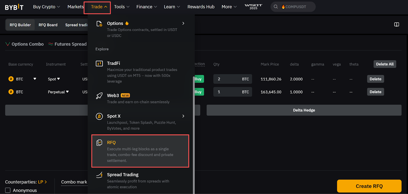 第 1 步:登录 Bybit 官网,在导航栏中点击交易 → RFQ,进入 RFQ 页面。
