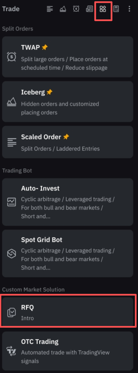 或者,点击右侧交易面板中的工具图标,从现货/合约交易页面进入 RFQ 页面。