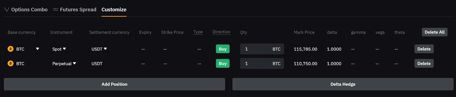 — 若需对冲风险,点击对冲 Delta,系统将自动为您新增对冲持仓。