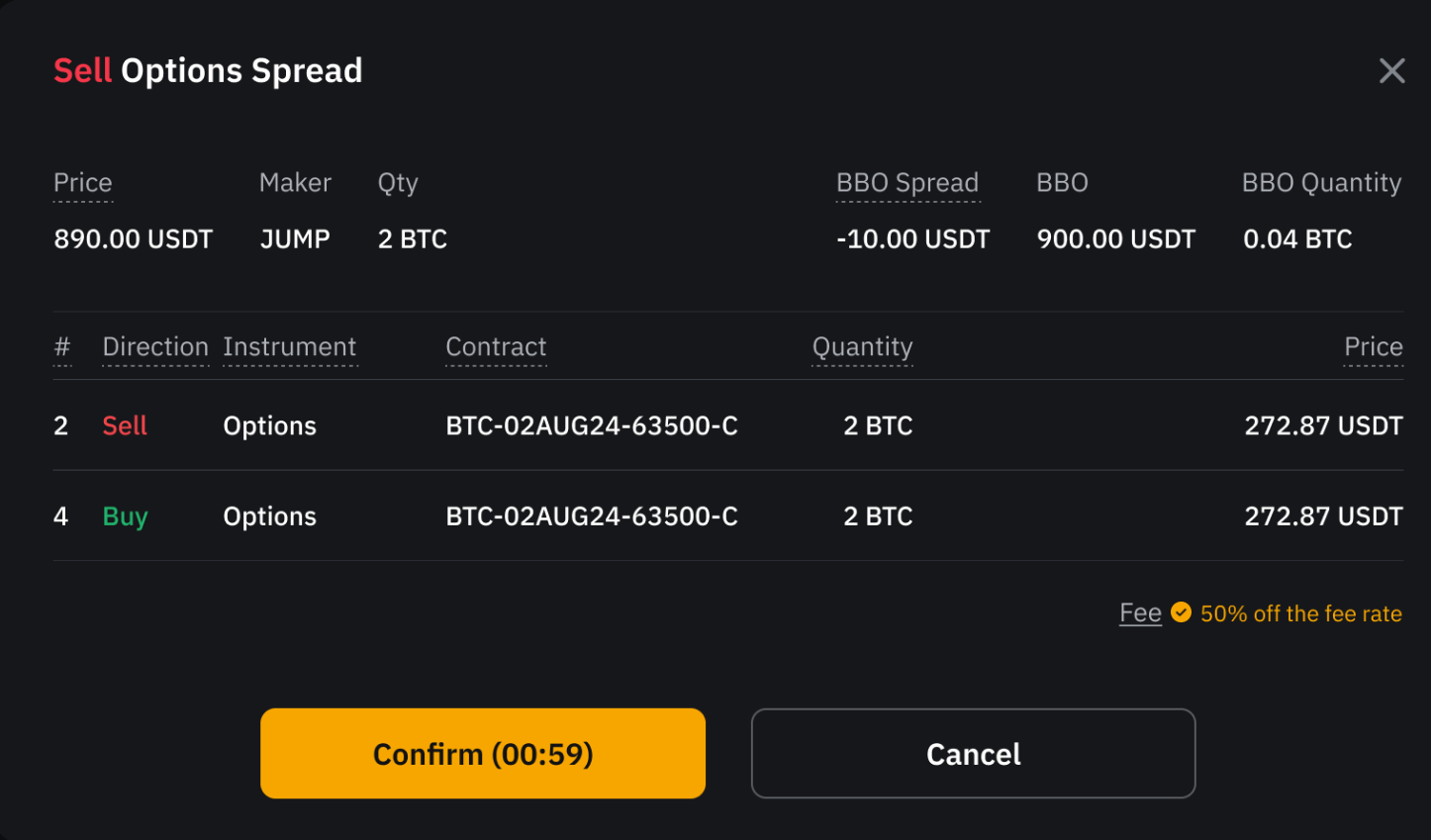 第 3 步:此时会显示一个确认窗口。仔细核实价格、Maker 和数量等报价详情后,点击确认即可执行交易,点击取消则放弃报价。