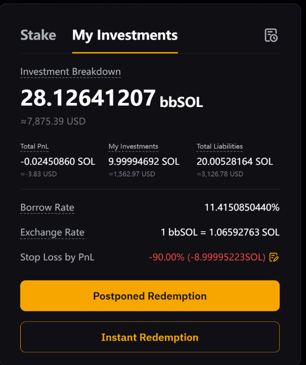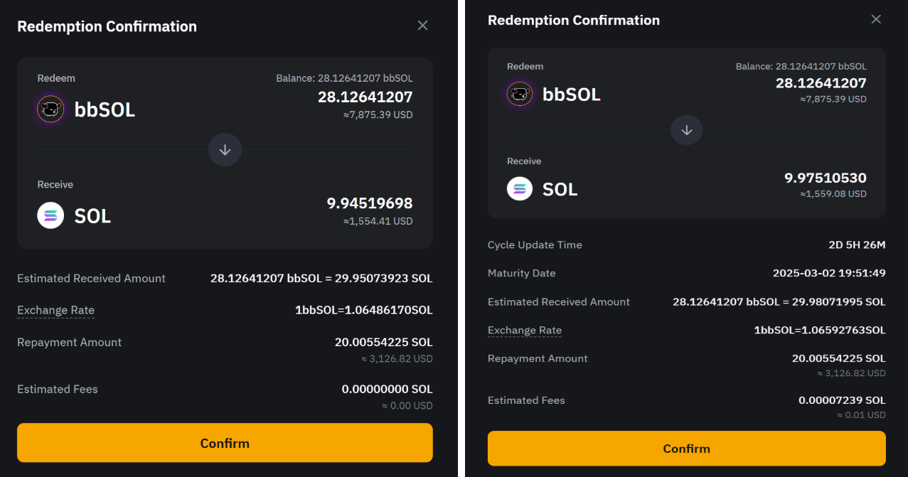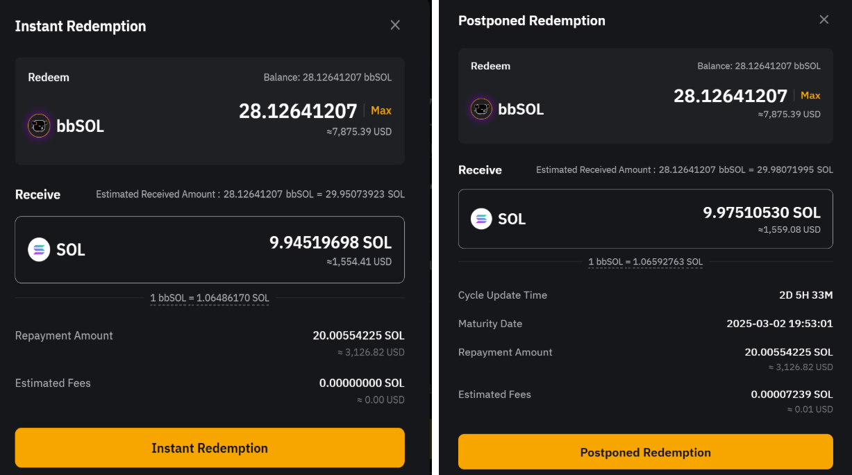 • 延时赎回:所有本金与收益将会在 1 - 4 天后到账,期间收益会继续累加。 当您提交赎回申请时,您的 bbSOL 将按实时汇率兑换为 SOL。