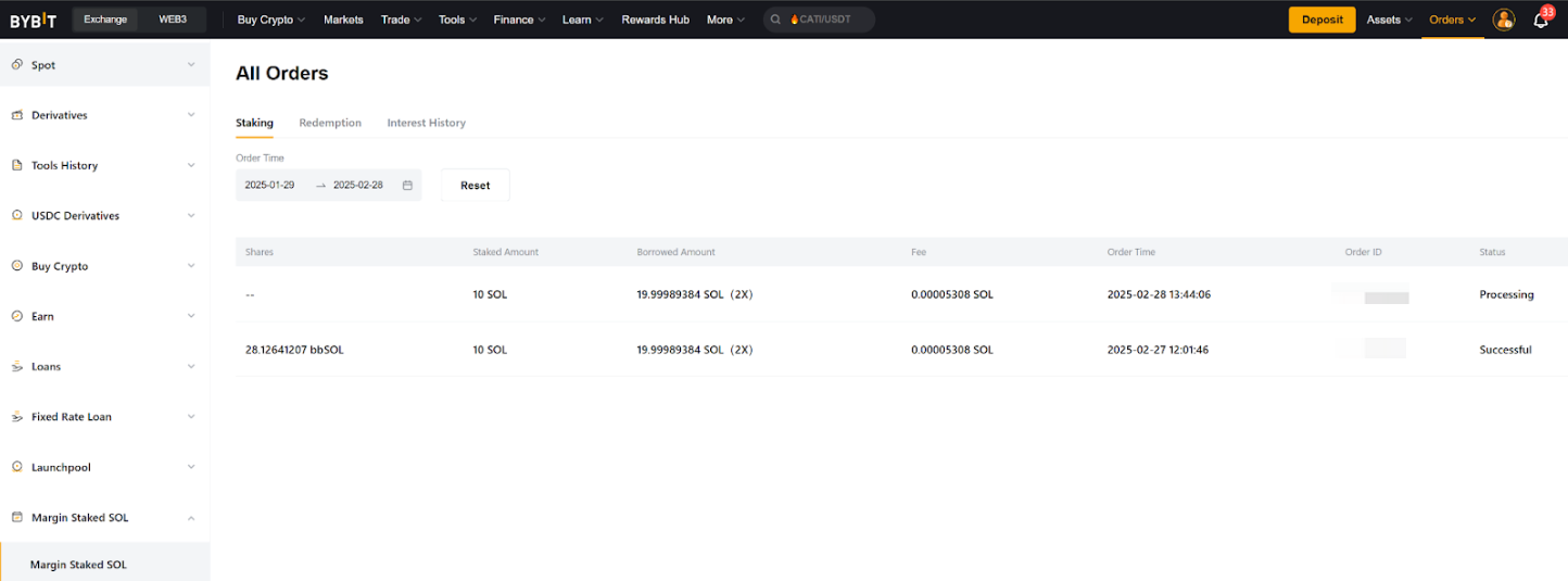 第 2 步:杠杆质押 SOL 订单页面中,您还可点击质押赎回利息记录,查看更多详情。