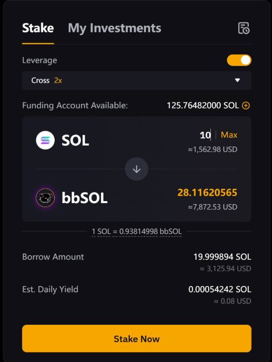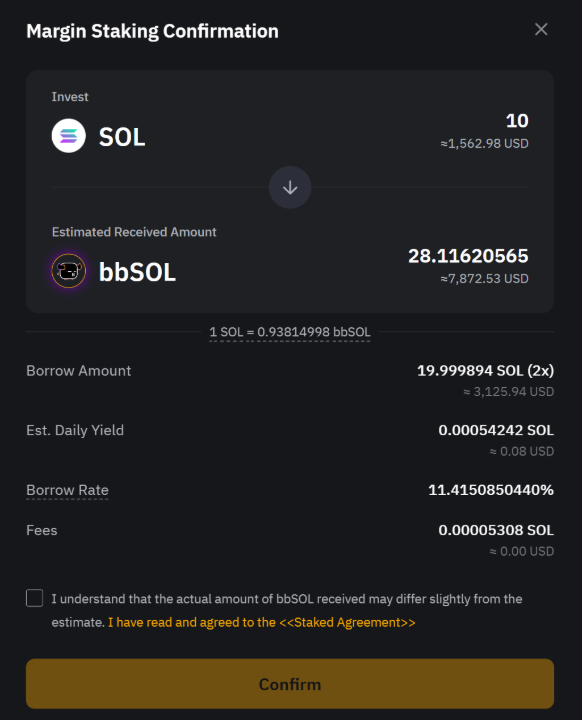 您预期可获得的 bbSOL 金额,根据您的杠杆率、质押的 SOL 金额以及 SOL 与 bbSOL 之间的实时汇率计算得出。