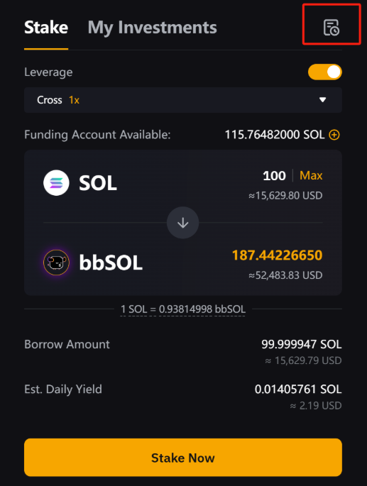 第 1 步:如需查看订单,请点击杠杆质押 SOL 主页中质押我的投资面板右上角的历史记录图标。