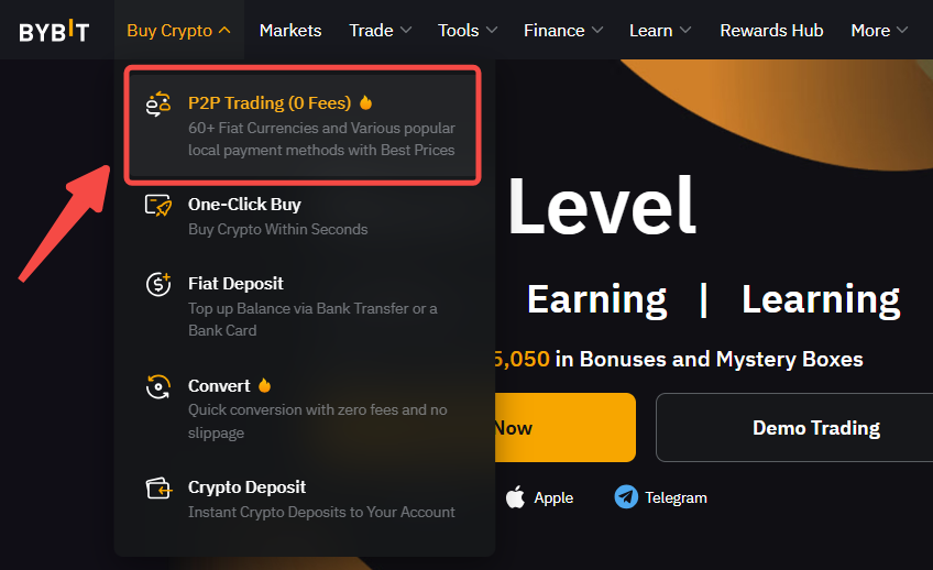 第 1 步:点击左上角导航栏的买币 → P2P 交易,进入 P2P 交易页面。