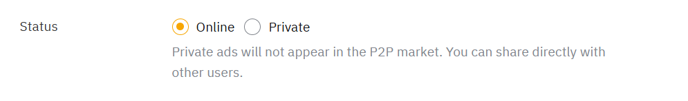 2. 非公开:广告不会显示在 P2P 广告页面上,只能由使用二维码或 URL 链接的交易者访问。