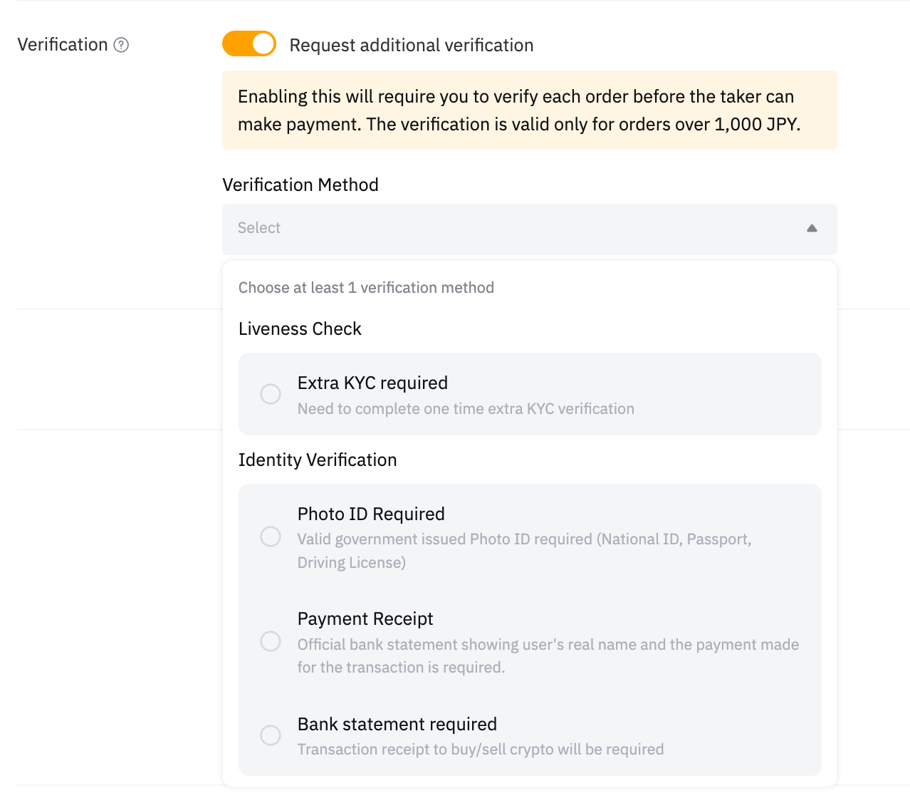 当认证广告方 (VA) 和大宗广告方 (BA) 启用验证要求时,当订单超过法定货币的指定阈值时,订单接受方需要完成与广告方的验证。双方有权在验证期内决定是否继续交易。广告方可在订单聊天框中要求订单接收方提供以下证明: