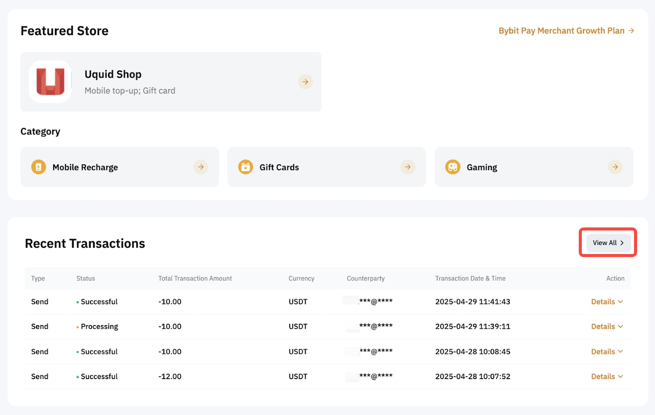 如要查看您的付款记录,请前往 Bybit Pay 页面,滚动至底部,然后点击查看全部。或者,请前往Pay 交易记录