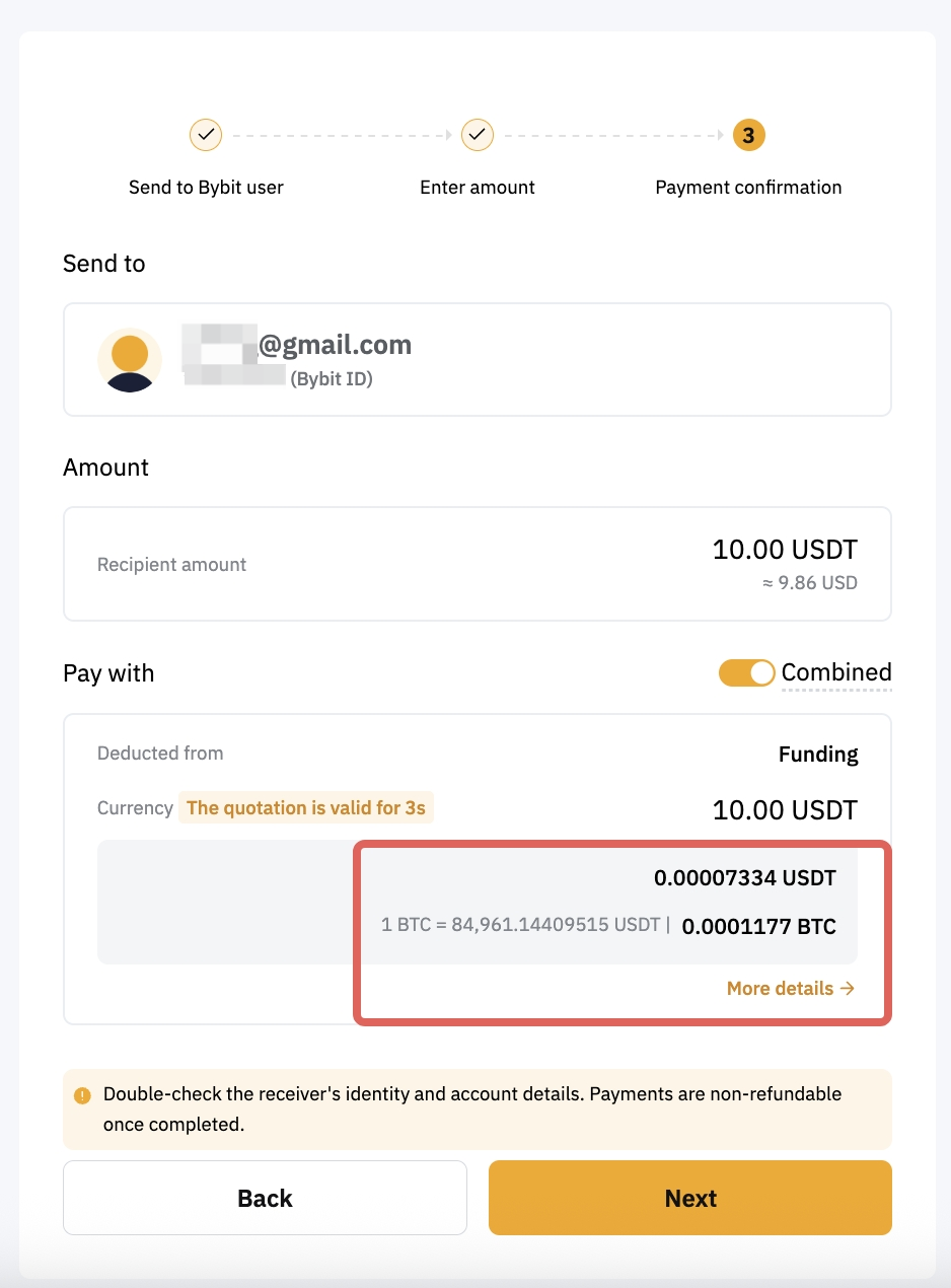 第 2 步:选择内部转账付款方式。您可以输入以下账户信息付款给其他 Bybit Pay 用户: