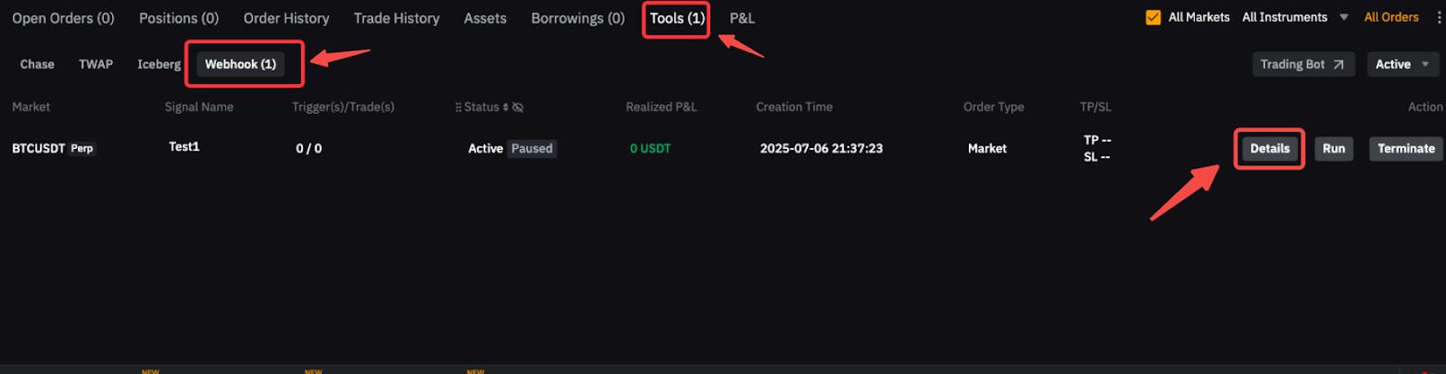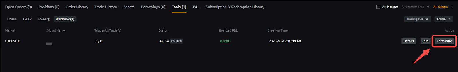 手动终止或暂停:要手动终止 Webhook 信号,请导航到工具选项卡。找到要关闭的 Webhook 发出的信号,然后点击终止。若要暂停策略,请点击暂停