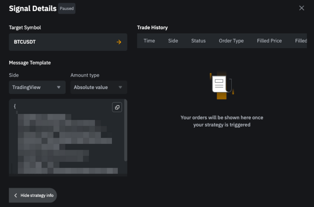 欲查看信号详情,请点击旁边的详情按钮,此处将显示 Webhook URL 和消息模板。此外,您还可以查看通过此策略执行的交易。