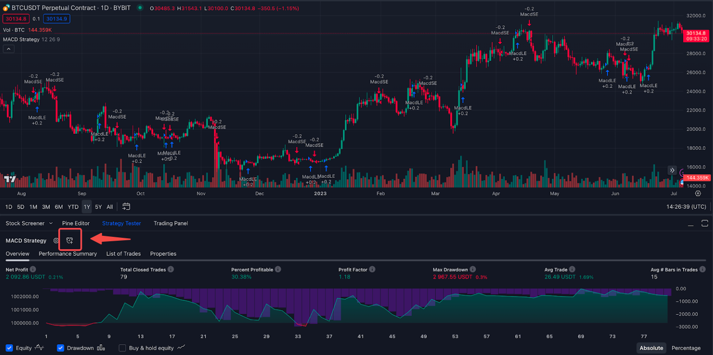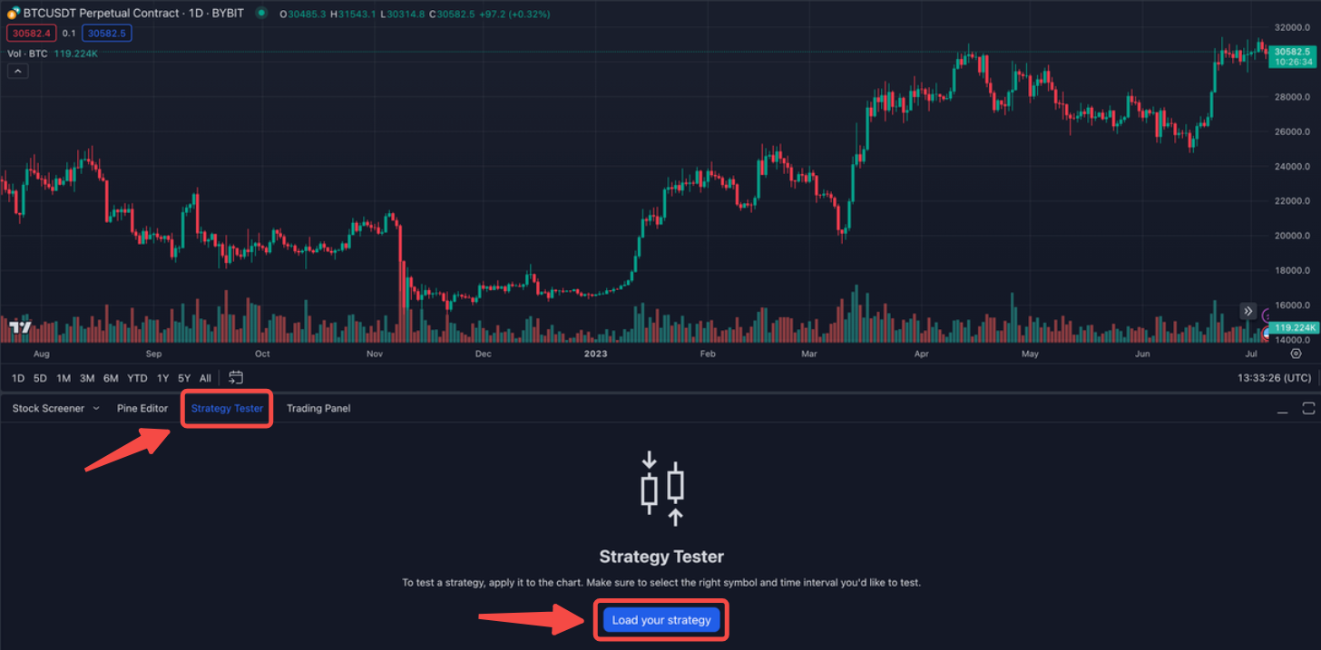 第 2 步:在 TradingView 页面上,点击策略测试器加载您的策略。