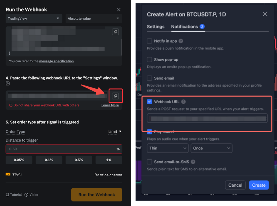 Webhook URL 可在 Bybit 页面找到,并粘贴到提醒通知选项卡中的 Webhook URL 字段。