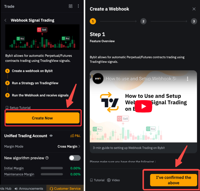 第 2 步:点击立即创建。请确保您已大致了解此功能。如需详细了解如何运行 Webhook 信号交易,请观看视频教程,然后点击我已确认