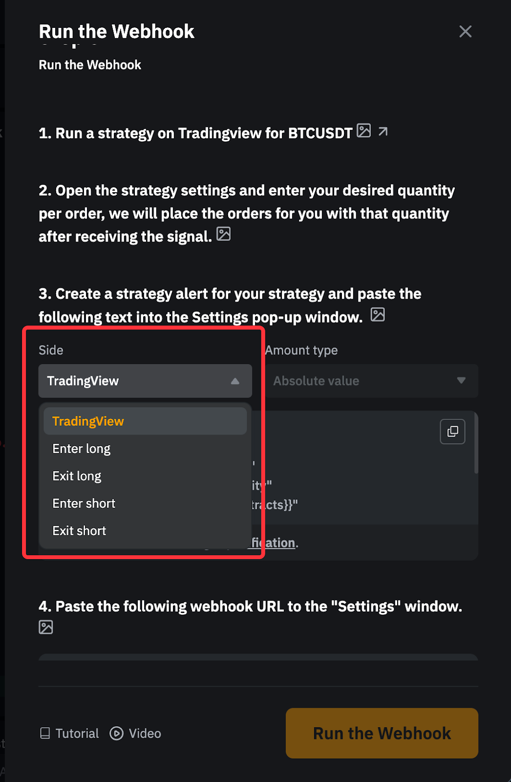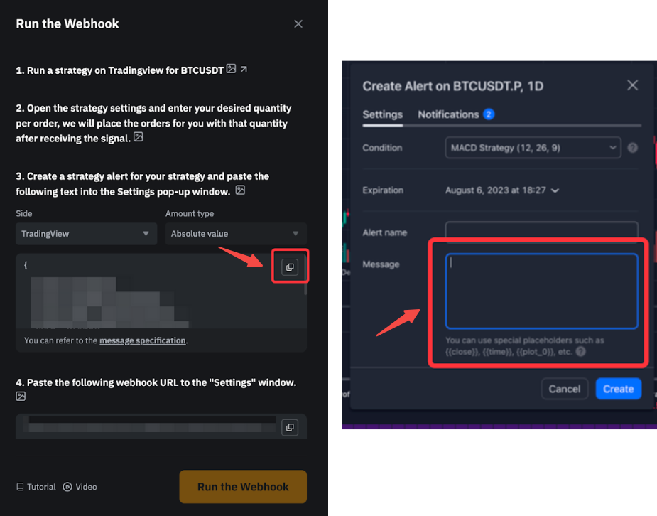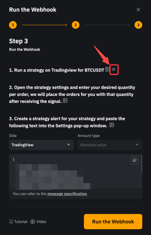 • 您可以从 Webhook 设置页面选择金额类型,也可以直接通过粘贴在 Tradingview 上的模板编辑参数值。