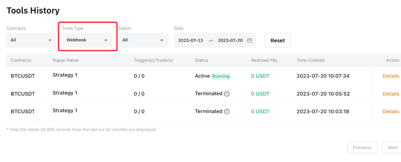 要查看 Webhook 信号的特定信息,请转至工具选项卡,然后选择 Webhook。在这里,您可以查看信号名称、触发/交易次数、已结盈亏和创建时间。
