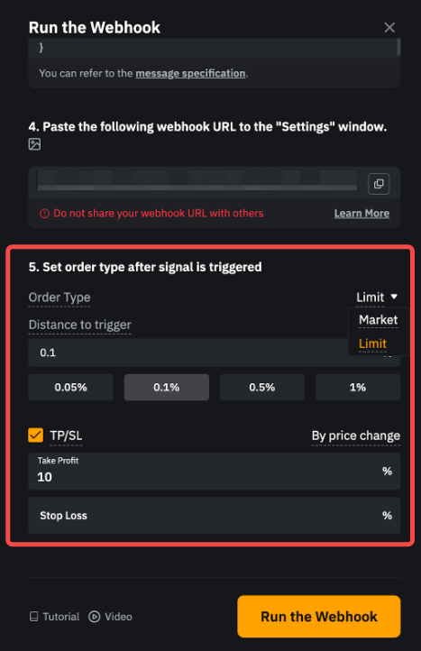 • 绝对值表示 Webhook 将根据配置的数量下单。