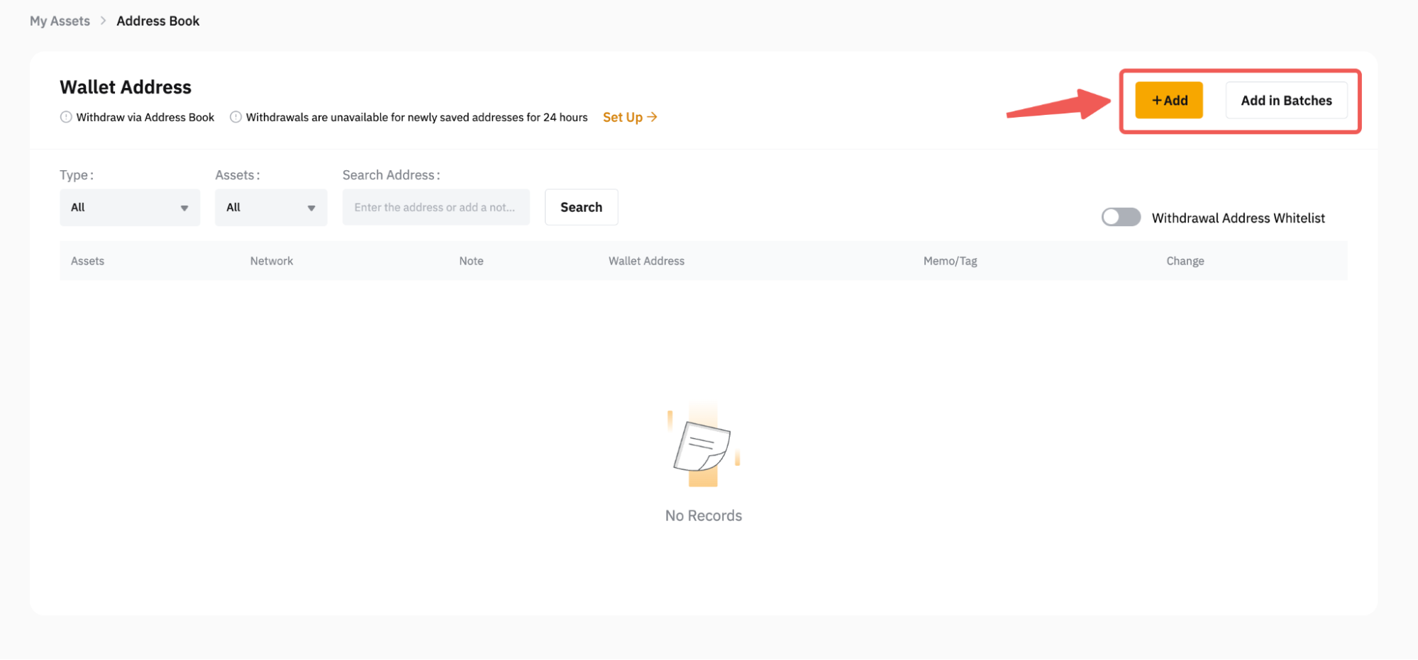 进入提币地址管理页面后,请点击页面右上角的添加按钮添加新钱包地址。如需同时添加多个地址,请点击批量新增地址。