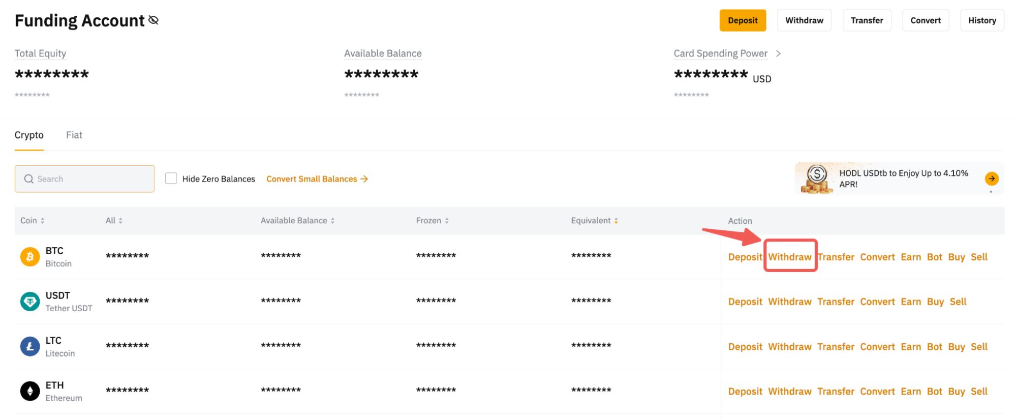或者,您也可以点击主页右上角的资产,前往资金账户。然后,点击您希望为其添加钱包地址的代币栏中的提现。