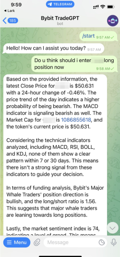 轻松访问,专业分析:直接在 Telegram 上接入 TradeGPT,轻松获取 Bybit 实时数据和前沿数据分析。