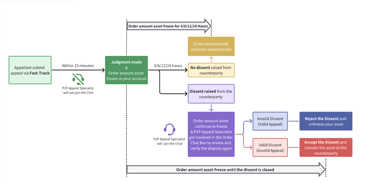 通过快速通道提交的申诉,将被在 15 分钟内作出判断,P2P 申诉专员不会参与订单对话框。完成判断后,订单金额将暂时冻结 4、8、12 或 24 小时,以便交易对手确认结果。冻结时间因策略而异,具体冻结时间请参考页面显示。
